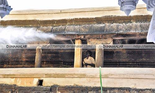 காஞ்சிபுரம்:காஞ்சிபுரம் வரதராஜ பெருமாள் கோவிலில், இரண்டாம் பிரகார மாடத்தை, சுத்தம் செய்யும் பணி, துவங்கி நடந்து வருகிறது. காஞ்சிபுரம், வரதராஜ பெருமாள் கோவிலில் உள்ள, வசந்த மண்டப இரண்டாம் பிரகார மாடம், வாகன மண்டபம் போன்றவை, 500 ஆண்டுகளுக்கு முன் கட்டப்பட்டவை. அவை, தற்போது சிதிலமடைந்து உள்ளதால், அவற்றை புதுப்பிக்க, கடந்த ஜனவரி மாதம், 50 லட்சம் ரூபாய் மதிப்பில் பணிகள் துவங்கின. அதில், தற்போது இரண்டாம் பிரகாரத்தில் உள்ள, மாடத்தின் மேல் தளம் மற்றும் தரைத் தளம் போன்றவை, சீரமைக்கப் பட்டு வருகின்றன. இந்த மாடத்தில் உள்ள, கல் துாண் போன்றவற்றில் பல ஆண்டுகளுக்கு முன், சுண்ணாம்பு பூசப்பட்டு இருந்தது. அவற்றை அகற்றும் வகையில், தண்ணீர் விட்டு சுத்தம் செய்யப்பட்டு வருகிறது. இதனால், அங்கு உள்ள கல் துாண்களின் இயற்கை தன்மை வெளியே தெரியத் துவங்கி உள்ளது. இதுகுறித்து, கோவில் நிர்வாக அதிகாரி ஒருவர் கூறுகையில், இரண்டாம் பிரகார மாடத்தின் உள் பகுதியில், சுண்ணாம்பு பூசப்பட்டு உள்ளது. அப்பகுதிகளில் தண்ணீர் விட்டு, சுண்ணாம்பை அகற்றி வருகிறோம். அடுத்த மாதத்திற்குள் மாடத்தை சீரமைக்கும் பணி முடிந்து விடும் என்றார்.