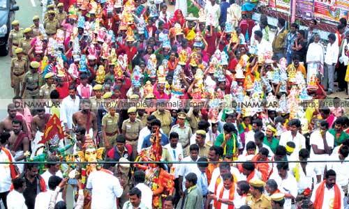 கொடைக்கானல்: கொடைக்கானல் இந்து மக்கள் கட்சி சார்பில் விநாயகர் சிலை ஊர்வலம் நடந்தது. இதற்கு மாநில இளைஞரணி துணை செயலாளர் குமரன் தலைமை வகித்தார். நகர தலைவர் கார்த்திக் வரவேற்றார். மாநில செயலாளர் ரவிபாலன் உட்பட பலர் பங்கேற்றனர். தலைவர் அர்ஜூன் சம்பத் கூறியதாவது: கொடைக்கானலில் மரங்கள் வெட்டப்பட்டு கடத்தப்படுவதால் பசுமை இழந்து காணப்படுகின்றது. கடத்துவோர் மீது நடவடிக்கை எடுத்து குண்டர் சட்டத்தில் கைது செய்ய வேண்டும். இந்து சேவை அறக்கட்டளை சார்பில் அடுத்த ஆண்டு 2 லட்சம் மரக்கன்றுகள் வைத்து வளர்க்கப்படும். கோயிலுக்கு சொந்தமான இடங்களில் ஆக்கிரமிப்புகள் செய்து, ரியல் எஸ்டேட் தொழில் செய்து வருபவர்களை ஒடுக்க வேண்டும். கொடைக்கானலில் சட்டவிரோதமாகவும், அனுமதியின்றியும் கட்டப்படும் கட்டடங்களை தடுக்க வேண்டும். சிறைக்காவலர்கள் தாக்கப்பட்டதால் சிறைச்சாலை, போலீஸ் ஸ்டேஷன்களுக்கு ராணுவ பாதுகாப்பு அளிக்கப்பட வேண்டும் என பிரதமர் மோடியிடம் கோரிக்கை அளிக்க உள்ளோம், என்றார்.
