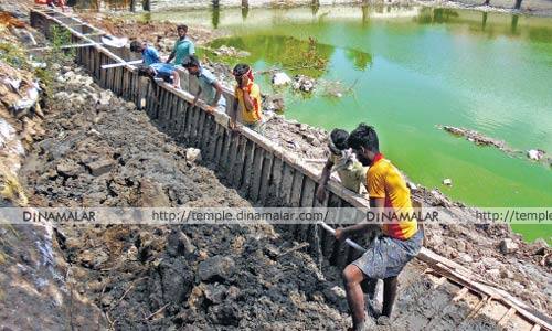 கீழக்கரை: உத்திரகோசமங்கை பிரம்ம தீர்த்தக்குளம் புராண சிறப்புடையது. இக்குளத்தில் சிவபெருமானிடம் சாபம் விமோசனம் பெற்ற பிரம்மன், நீராடி பாவங்களை போக்கியதால் பிரம்ம தீர்த்தக்குளம் என்று கூறப்படுகிறது. இந்த குளம் மங்களநாதசுவாமி கோயிலுக்கு முன் 2 ஏக்கரில் அமைந்துள்ளது. இந்த குளத்தின் வடக்குப்பகுதி தடுப்புச்சுவர் சேதமடைந்து கருவேல மரங்கள் முளைத்திருந்தன. இதுகுறித்து தினமலரில் செய்தி வெளியிடப்பட்டது. இதையடுத்து ராமநாதபுரம் கலெக்டர் நந்தகுமாரின் உத்தரவில் புண்ணிய ஸ்தலங்களுக்கான சிறப்பு நிதித் திட்டத்தில் ரூ.22 லட்சத்தில் குளம் சீரமைக்கப்பட்டு வருகிறது.