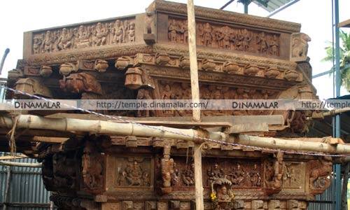 இச்சூழலில், பழுதடைந்த தேருக்கு பதிலாக, புதுத்தேர் அமைக்கும் திருப்பணிகள் மேற்கொள்ள திட்டமிடப்பட்டு, 27.5 லட்சம் ரூபாய் செலவில், கடந்த ஆண்டு பணிகள் துவங்கின. பெரம்பலுார் மற்றும் பழநியைச் சேர்ந்த 15 சிற்பிகள் திருப்பணியில் ஈடுபட்டுள்ளனர். ஓராண்டாக நடந்து வரும் இத்தேர் அமைக்கும் பணி, தற்போது முடிவு பெறும் நிலைக்கு வந்துள்ளது. இதுகுறித்து கோவில் அலுவலர்களிடம் கேட்டபோது, தற்போது, புதிய தேர் அமைக்கும் பணி வேகமாக நடக்கிறது. சிற்ப வேலைப்பாடுகளுடன் திருப்பணிகள் நடக்கிறது. இன்னும் ஒரு மாதகாலத்தில் இப்பணிகள் நிறைவு பெற்று விடும். அதன்பிறகே, கோவில் திருவிழா நடத்த நடவடிக்கை மேற்கொள்ளப்படும், என்றனர்.