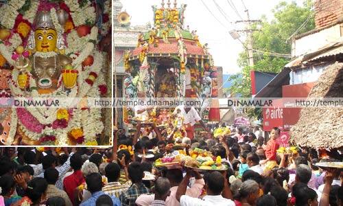 தேரோட்டம்: 7 ம்நாளான நேற்று தேரோட்டம் நடந் தது. அதிகாலை அம்மன் தேரில் எழுந்தருள தேரானது ரதவீதிகள் வழியாக வந்தது. ஆயிரக்கணக்கான பக்தர்கள் தேரை வடம்பிடித்து இழுத்தனர். ஆடு, கோழி பலியிட்டும், மாவிளக்கு ஏந்தியும் நேர்த்திக்கடன் செலுத்தி வழிபட்டனர். தேர் மதியம் 11.30 மணிக்கு நிலைக்கு வந்து சேர்ந்தது. அம்மன் கோயிலுக்கு எழுந்தருள மாலையில் மஞ்சள் நீராட்டு நடந்தது.