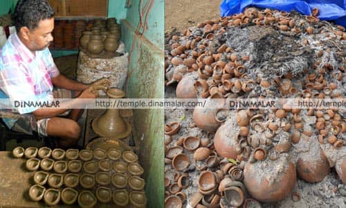 இது குறித்து மேலஒடுதுறை உள்ள மண்பாண்ட தொழிலாளர் மாரிமுத்து கூறியது. மண்பாண்ட தொழிலில் கடந்த 20 ஆண்டுகளாக ஈடுப்பட்டு வருகிறோம் அகல் விளக்குகள் இந்த வருடம் நாகைப்பட்டினம், திருவாரூர், பொறையார் ஆகிய பகுதிகளில் இருந்து அகல்விளக்கிற்கு ஏராளமான ஆர்டர்கள் வந்துள்ளது. ஆனால் கடந்த ஒரு வாரமாக பெய்யும் மழையால் அகல் விளக்கு செய்யும் பணி தாமதமாகி வருகிறது. சகிலா என்ற கைவீல் கொண்டு அகல்விளக்கு செய்து நல்ல வெயிலில் அகல்விளக்கை காயவைத்து சுட்டு விற்பனை செய்துவருகிறோம். 100 அகல்விளக்கு ரூ.90க்கு வெளியில் உள்ள வியாபரிகள் மொத்தமாக வாங்கி செல்கின்றனர். மேலும் பொங்கல் பண்டிகை வருவதால் பொங்கல் பானை செய்யும் பணி அகல் விளக்கு பணி முடிந்தவுடம் துவங்கப்படும் என்று கூறினார்.
