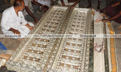 திருச்சி: ஸ்ரீரங்கம் ரங்கநாதர் கோவிலில், ரங்கா ரங்கா கோபுர நுழைவாயிலுக்கு, தசாவதார சிலைகள் வடிக்கப்பட்ட பிரம்மாண்ட கதவு நேற்று காலை பொருத்தப்பட்டது.