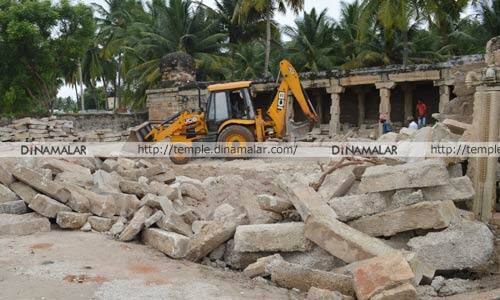 அவிநாசி: பல நூறு ஆண்டுகள் பழமைவாய்ந்த பெருமாள் கோவிலில், திருப்பணி துவங்கியுள்ளது; பக்தர்கள் மகிழ்ச்சி அடைந்துள்ளனர். கருவலூர் அருகே ராமநாதபுரத்தில், ஸ்ரீவேணுகோபால சுவாமி கோவில் உள்ளது. கருவலூர் மாரியம்மன் கோவில் கட்டுப்பாட்டிலுள்ள இக்கோவில், 800 ஆண்டுகள் பழமையானது. முற்றிலும் கற்கோவிலாக உள்ள இங்கு, கும்பாபிஷேகம் செய்யப்பட்டு, 300 ஆண்டுகளுக்கு மேலாகிறது. யாரும் கண்டுகொள்ளாததால், சமூக விரோதிகளின் புகலிடமாக மாறியது; சுவாமி சிலைகள் திருடுபோயின; சில சிலைகள், சேதப்படுத்தப்பட்டன. இதையறிந்த பக்தர்கள், மனவேதனை அடைந்து, கோவிலில் திருப்பணி மேற்கொள்ள வேண்டும் என, கோரிக்கை விடுத்தனர். அறநிலையத்துறை அதிகாரிகள் ஆய்வு செய்து, திருப்பணி நடத்த முடிவு செய்தனர். இதற்காக, 13வது நிதிக்குழு வாயிலாக, 36 லட்ச ரூபாய் ஒதுக்கப்பட்டுள்ளது. முதல்கட்டமாக கருவறை, அர்த்த மண்டபம் இடிக்கப்படுகிறது.