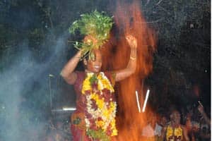 திருநெல்வேலி மாவட்டம், சங்கரன்கோவில் அருகே மாவிலியூத்து கோயிலில் நடந்த பூக்குழி விழாவில் எரியும் நெருப்பில் இறங்கிய பெண் பக்தர்.