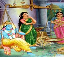 கிருஷ்ண பகவான் பாமா, ருக்மணி இருவர் மீதும் சமமாக அன்பு வைத்திருந்தார். இதில் ருக்மணி கிருஷ்ணன் மீது அளவில்லாத அன்பும், ஆழமான பக்தியும் கொண்டிருந்தாள். அத்துடன் கிருஷ்ணனை தன் மனதில் வைத்து எப்போதும் பூஜித்து வந்தாள். ஆனால் பாமாவோ, விஷ்ணு தன்னை மார்பில் சுமந்திருப்பதாலும், கண்ணனுக்கு தேரோட்டியாக இருந்ததாலும், தனது திருமணத்தின் போது ஏராளமான செல்வம் கொண்டு வந்தாலும் நாரதரின் உதவியோடு கண்ணனை தனக்கே உரிமையாக்கிகொள்ள நினைத்தாள். இதற்காக கண்ணனை, துலாபார தராசு தட்டின் ஒரு புறமும், மற்றொரு தட்டில் தனது செல்வம் முழுவதையும் வைத்தாள். ஆனால் தராசு சமமாகவில்லை. அப்போது அங்கு வந்த ருக்மணி, கண்ணனுக்காக கொடுக்க தன்னிடம் ஒன்றுமில்லையே என வருந்தி, கண்ணனுக்கு பிடித்த துளசி இலை ஒன்றை தராசு தட்டில் வைத்த போது தராசு சமமாகியது. கண்ணன் புன்முறுவலுடன், நான் இப்போது யாருக்கு சொந்தமானவன் என்பது உங்களுக்கே புரிந்திருக்கும். நான், எனது என்ற அகந்தையை ஒழித்து, உண்மையான பக்தியுடன் என்னை சரணடைபவருக்கே நான் சொந்தம், என்றார். தனது அகந்தை நீங்கிய நிலையில் கண்ணனின் பாதத்தில் விழுந்து மன்னிப்பு கேட்ட பாமா, அந்த துளசி இலையை தன் தலையில் சூடிக்கொண்டாள்.
