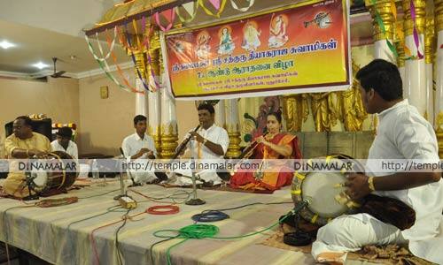 புதுச்சேரி: கலைமகள் சத்குரு தியாகராஜ சுவாமி ஏழாம் ஆண்டு ஆராதனை விழா பாக்கமுடையான்பட்டு பார்வதி திருமண மண்டபத்தில் நடந்தது இதையொட்டி, நாதஸ்வர தம்பதிகள் பழனிவேல், பிரபாவதி பழனிவேல் ஆகியோரின் சிறப்பு நாதஸ்வர தவில் இசை கச்சேரி நடந்தது. சிதம்பரம் அண்ணாமலைப் பல்கலைக்கழக தவில் ஆசிரியர் துர்காராவ், காஞ்சி காமகோடி பீடம் ஆஸ்தான தவில் வித்வான் செந்தில்குமார் உள்ளிட்ட நாதஸ்வர வித்வான்கள் பலர் கலந்து கொண்டனர்.