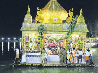அங்கிருந்து திருமுக்குளத்தின் தெற்குபகுதி வழியாக எண்ணெய்காப்பு மண்டபம் வந்தடைந்தனர். மின்விளக்குகள்அங்கும் சிறப்பு பூஜைகள் செய்யப்பட தெப்பதேரில் ஆண்டாள், ரெங்கமன்னார் எழுந்தருளினார். இரவு 8.30 மணிக்குமேல் தெப்ப தேரோட்டம் நடக்க , தேரானது மூன்று முறை வலம் வந்தது .குளத்தை சுற்றி அலங்கரிக்கப்பட்டிருந்த மின்விளக்குகள் ஜொலிக்க, ஏராளமான பக்தர்கள் பங்கேற்றனர். இன்றும் தெப்பம் ஏற்பாடுகளை தக்கார் ரவிசந்திரன், செயல்அலுவலர் ராமராஜா செய்திருந்தனர். இதுபோல் இன்றும், நாளையும் இரவு 7 மணிக்கு தெப்பதேரோட்டம் நடக்கிறது.