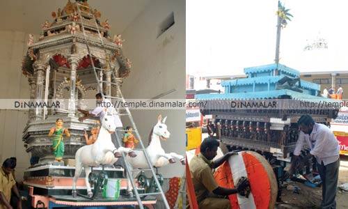 புதுப்பிப்பு: தேர்த்திருவிழா நாளை துவங்குகிறது. இதனையடுத்து, அம்மன் எழுந்தருளும் வெள்ளித்தேர் மற்றும் விநாயகப் பெருமான் எழுந்தருளும் தேரினையும் புதுப்பிக்கும் பணியில் கோவில் பணியாளர்கள் ஈடுபட்டு வருகின்றனர். தேரில், வர்ணம் பூசுதல் உள்ளிட்ட பணிகள் நடந்து வருகின்றன.