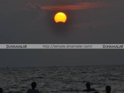 இன்று சூரியகிரகணத்தை முன்னிட்டு, அதிகாலை 3 மணிக்கு ராமேஸ்வரம் கோயில் நடை திறந்து 4 மணி வரை ஸ்படிகலிங்க பூஜை நடந்தது. பின், கோயிலில் இருந்து காலை 4.50 க்கு பிரதோஷ உற்சவ மூர்த்தி சுவாமி (ராமநாதசுவாமி, பர்வதவர்த்தனி அம்மன்) தங்க ரிஷப வாகனத்தில் புறப்பாடாகி, அக்னி தீர்த்த கடற்கரையில் எழுந்தருளியதும், கோயில் நடை சாத்தப்பட்டது. அக்னி தீர்த்த கரையில் காலை 6.28 முதல் 6.38 மணி வரை வானில் பகுதி நேர சூரியகிரகணம் நடந்தது. சூரியகிரகணம் முடிந்ததும், பிரதோஷ உற்சவ மூர்த்தி சுவாமி காலை 6.39 க்கு பக்தர்களுக்கு தீர்த்த வாரி உற்சவம் நடந்ததும் மகா தீபாரதனை நடைபெற்றது. பின் காலை 6.50 க்கு பிரதோஷ உற்சவ மூர்த்தி புறப்பாடாகி, கோயிலுக்கு சென்றதும் நடை திறக்கப்பட்டது. கோயிலில் சுவாமி, அம்மனுக்கு கிரஹணம் சிறப்பு அபிஷேகம், பூஜை நடந்தது. இதில் ஏராளமான பக்தர்கள் பங்கேற்று தரிசனம் செய்தனர்.
