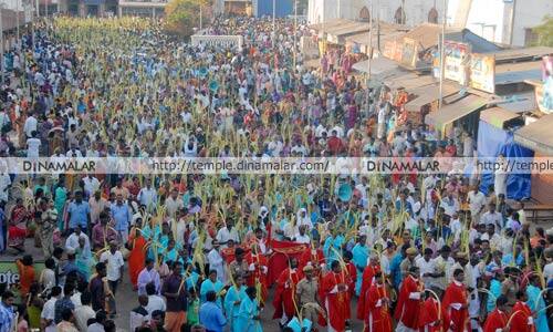 தொடர்ந்து காலை ஏழு மணிக்கு குருத்தோலை புனிதம் செய்யப்பட்டு, பங்கு பாதிரியார் சூசைமாணிக்கம் தலைமையில் குருத்தோலை பவனி நடந்தது. ஆயிரக்கணக்கான மக்கள் கைகளில் குருத்தோலை ஏந்தி தேவாலய வளாகத்தை ஒட்டிய வீதிகளில் பவனி வந்தனர். தொடர்ந்து பேராலய கீழ் கோவிலில் தமிழ், தெலுங்கு,மலையாளம், ஆங்கிலம், இந்தி ஆகிய மொழிகளிலும் திருப்பலியும், செபமாலையும் நடந்தது.இதில் பல்வேறு பகுதிகளில் இருந்து வந்திருந்த பல்லாயிரக்கணக்கான பக்தர்கள் பங்கேற்றனர். அதே போல் நாகை,லுõர்துமாதா தேவாலயம், மயிலாடுதுறை,சோழவித்தியாபுரம், கருங்கண்ணி, மேமாத்துர் உட்பட மாவட்டத்தில் உள்ள கிறிஸ்தவ தேவாலயங்களில் பங்கு பாதிரியார்கள் தலைமையில் நடந்த குருத்தோலை பவனியில் ஏராளமானவர்கள் கலந்து கொண்டனர்.