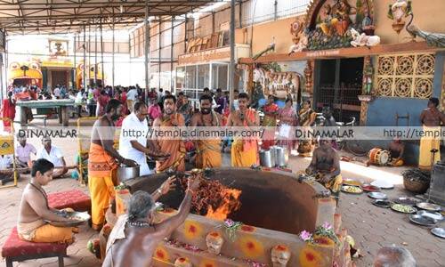 புதுச்சேரி: மொரட்டாண்டி பிரத்தியங்கிரா கோவிலில், சித்திரை மாத அமாவாசையான நேற்று, மக்கள் நலன் வேண்டிய, நிகும்பலா யாகம் நடந்தது. புதுச்சேரி அடுத்த மொரட்டாண்டியில் 72 அடி உயர மகா பிரத்தியங்கிரா காளி கோவில் அமைந்துள்ளது. இங்கு, அமாவாசை மற்றும் தேய்பிறை அஷ்டமி தினத்தில் சிறப்பு ஹோமங்கள் நடத்தப்பட்டு வருகிறது. இங்கு, மிளகாய் வற் றல் கொண்டு நடத்தப்படும் நிகும்பலா யாகம் சிறப்பு பெற்றது. இந்த யாகத்தில் பங்கேற்று அம்பாளை தரிசித்தால் சகல நன்மைகளும் கிடைக்கும், எதிரிகள் தொந்தரவு நீங்கும் என்பது ஐதீகம். அந்த வகையில், சித்திரை மாத அமாவாசையான நேற்று, மக்கள் நலன் வேண்டி நிகும்பலா யாகம் நடத்தப்பட்டது. காலை 9.00 மணிக்கு பிரத்தியங்கிரா காளிக்கு, சிறப்பு அபிஷேக ஆராதனைகள் நடந்தது. தொடர்ந்து, 12.00 மணிக்கு கலச பூஜையும், 12.30 மணிக்கு கோவில் குருக்கள் நடாதூர் ஜனார்த்தன சுவாமிகள் தலைமையில், வேத மந்திரங்கள் ஓத, யாககுண்டத்தில் மிளகாய் வற்றல், இனிப்பு, காய்கறிகள், பழங்கள் கொட்டி யாகம் நடத்தப்பட்டது. இதில், காங், மாநில தலைவர் நமச்சிவாயம் மற்றும் திரளான பக்தர்கள் பங்கேற்று சுவாமி தரிசனம் செய்தனர்.