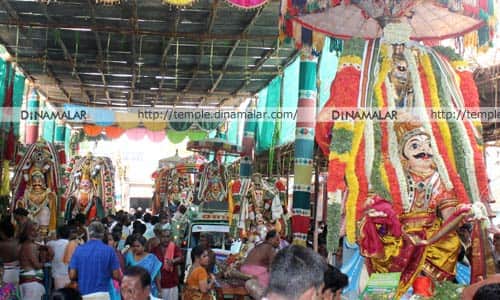 தஞ்சாவூர்: கும்பகோணத்தில், அட்சய திரிதியை முன்னிட்டு, ஒரே இடத்தில் பெருமாள்கள் சேவை சாதிக்கும், 12 கருடசேவை தரிசனம், நேற்று கோலாகலமாக நடந்தது. தஞ்சாவூர் மாவட்டம், கும்பகோணத்தில், புகழ்பெற்ற திருவிழாக்களில் ஒன்றாக கருதப்படுவது, 12 கருடசேவையாகும். ஒவ்வொரு ஆண்டும், சித்திரை மாதம் வளர்பிறையில், அமாவாசைக்கு பிறகு வரும் மூன்றாவது திதியான அட்சய திரிதியை தினத்தில், கும்பகோணத்தில் உள்ள, 12 வைணவ கோவில்களிலிருந்து, 12 கருட வாகனங்களில் உற்சவ பெருமாள் புறப்பட்டு, பெரிய தெருவில் காசிக்கடைகளுக்கு எதிரில் அமைக்கப்பட்டுள்ள பந்தலில் எழுந்தருளி, ஒரே இடத்தில் மக்களுக்கு சேவை சாதிப்பர். நேற்று கும்பகோணம் பெரிய தெருவில் அமைக்கப்பட்டுள்ள பந்தலில், சாரங்கபாணி, சக்கரபாணி, ராமசுவாமி, ராஜ கோபால சுவாமி, ஆதிவராக பெருமாள், கிருஷ்ணசுவாமி, ராமசுவாமி, சந்தானகோபாலகிருஷ்ணன், நவநீதகிருஷ்ணன், வேணுகோபாலசுவாமி, வரதராஜபெருமாள், லஷ்மி நரசிம்ம சுவாமி ஆகிய, 12 கோவில்களிலிருந்து பெருமாள் சுவாமிகள், கருட வாகனத்திலும், இந்த சுவாமிகளுக்கு நேர் எதிரே ஆஞ்சநேயர் சுவாமியும் எழுந்தருளி, சேவை சாதித்தனர். நேற்று, காலை 9.45 மணி முதல் மதியம்,12.45 மணி வரை, 12 கருட சேவையையும் பக்தர்கள் நீண்ட வரிசையில் நின்று தரிசனம் செய்தனர். இந்தநிலையில், பந்தலுக்கு சக்கரபாணி கோயில் கருட வாகனத்தை மட்டும் அங்கு நின்று போலீசார் போக்குவரத்துக்கு இடையூராக இருப்பதாக கூறியுள்ளார். இதனால் அங்கு இருந்த வாகனம் மீண்டும் கோவிலுக்கு திரும்பி சென்றது. இச் சம்பவம் பக்தர்கள் மத்தியில் பெரும் அதிர்ச்சியை ஏற்படுத்தியது.
