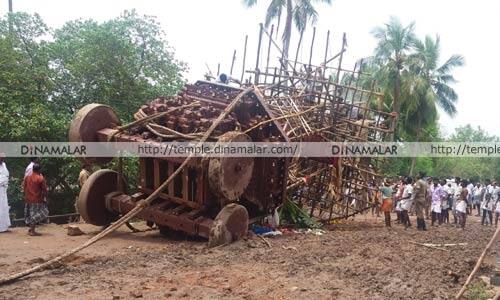 திருவாரூர்: திருவாரூர் அருகே,திருக்கரவாசலில் சேற்றில் தேர் சிக்கியதில் கொத்தனார் இருவர் பலியாயினர். திருவாரூர் அருகே,திருக்கரவாசலில் நீலோத்தம்பாள் உடனுறை தியாகராஜ சுவாமி கோவில் உள்ளது.இக்கோவிலில், பிரமோற்சவ விழா நடந்து வருகிறது.ஒன்பதாம் நாள் விழாவாக நேற்று தேரோட்டம் நடைபெறுவதாக இருந்தது. நேற்று காலை 8:30 மணிக்கு, தியாகராஜர்,நீலோத்தம்பாள் சுவாமிகள் தேருக்கு எழுந்தருளினர். காலை 9:30 மணிக்கு, பக்தர்கள் தேரை வடம் பிடித்த இழுக்க துவங்கினர்.இருபது அடி துாரம் வந்தவுடன், சேற்றில் தேர் சிக்கியது.இருப்பினும்,தேரை பக்தர்கள் தொடர்ந்து இழுத்தனர். திருவாரூரைச் சேர்ந்த கொத்தனார்களான கல்யாண சுந்தரம்,55;முருகையன்,45, ஆகிய இருவரும் தேருக்கு முட்டுக்கட்டை போட்டு வந்தனர். தேர் சேற்றில் உட்கார்ந்து முன்புறம் சாய துவங்கியதும் பக்தர்கள் சிதறி ஓடினர்.பக்தர்கள் சத்தமிட்டும், முட்டுக்கட்டை போட்ட இருவரும் வெளியே வரமுடியாமல் தேரின் முன்புறம் இருந்த குதிரை வாகனத்தில் சிக்கினர். படுகாயமடைந்த இருவரும், திருவாரூர் மருத்துவ கல்லுாரி மருத்துவமனைக்கு துாக்கிச் செல்லப்பட்டனர். வழியில் இருவரும் இறந்தனர். போலீசார் விசாரிக்கின்றனர். கடந்த சில தினங்களாக திருவாரூர் மாவட்டத்தில் மழை பெய்து வருகிறது.நேற்று இரவும் கனமழை பெய்தது.தேர் வீதி உலா வரும் சாலைகள் மிக மோசமாக உள்ளன.தார் சாலையான மூன்று வீதிகளும் மண்சாலை போல் காட்சி அளிக்கின்றன. மழை காரணமாக, தேர் கவிழ்ந்த இடத்தில் மண்,கல் கொட்டி நிரப்பி உள்ளனர். இருப்பினும்,தேர் கவிழ்ந்து விபத்து நடந்து, இருவர் பலியான சம்பவம் அப்பகுதியில் சோகத்தை ஏற்படுத்தியுள்ளது.