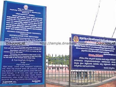 திருத்தணி: திருத்தணி முருகன் கோவில் சரவணபொய்கை குளத்தின், ஏழு நுழைவு வாயில்களில் பக்தர்களுக்கு அறிவிப்பு மற்றும் எச்சரிக்கை பலகை வைத்து விழிப்புணர்வு ஏற்படுத்தியுள்ளனர்.