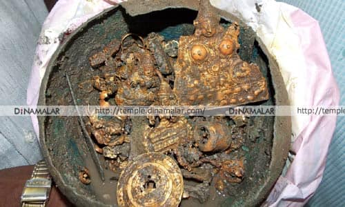 காரைக்கால்: காரைக்கால் திருநள்ளார் பகுதியில் விவசாயி வீட்டு தோட்டத்தில் பழமையான சுவாமி சிலை கண்டுபிடிக்கப்பட்டது காரைக்கால் திருநள் ளார் அகலகண்ணு பகுதியை சேர்ந்த பன்னீர்செல்வம். விவசாயி. இவரது தோட்டத்தில் வீடு கட்டுவதற்காக பள்ளம் தோண்டும் பணி நடந்து வருகிறது. அப்போது, திடீரென பலமான சத்தம் கேட்டுள்ளது. கவனமாக பள்ளம் தோண்டிய போது, 4 கிலோ மதிப்பில் பழக்கால சுவாமி சிலைகள், தகடுகள் மற்றும் ஆபரணங்கள் கண்டு பிடிக்கப்பட்டது. பன்னீர்செல்வம் கொடுத்த தகவலில் பேரில், திருநள்ளார் தாசில்தார் முத்து,வருவாய்த்துறை அதிகாரி தண்டபாணி உள்ளிட்ட அதிகாரிகள் சுவாமி சிலை கிடைந்த இடத்திற்கு விரைந்தனர். கிடைத்த அனைத்து சிலைகளையும், சார்பு ஆட்சியர் கேசவன் முன்னிலையில் ஒப்படைந்தனர். பின்னர் தொல்பொருள் அதிகாரிகளுக்கு தகவல் கொடுக்கப்பட்டது. அவர்கள் ஆய்வுக்கு பின்னரே சிலைகளின் மதிப்பு தெரிய வரும்.