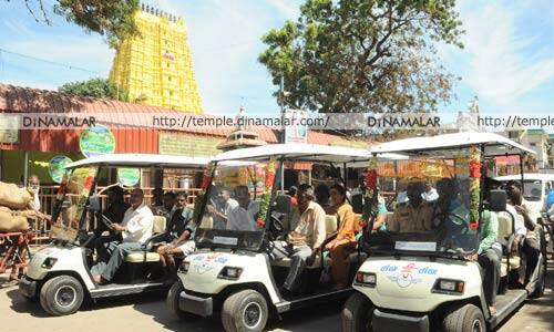 ராமேஸ்வரம்: ராமேஸ்வரம் ராமநாதசுவாமி கோயில் ரதவீதியில் பக்தர்கள் வசதிக்கு,கோயில் சார்பில் 3 புதிய பேட்டரி கார்கள் இயக்கப்பட்டது. ராமேஸ்வரம் கோயிலுக்கு பயங்கரவாதிகள் அச்சுறுத்தலால், 2013ம் ஆண்டு முதல் கோயில் ரதவீதியில் வாகனங்கள் செல்ல போலீசார் தடை விதித்தனர். இதனால் ரதவீதியில் செல்லும் பக்தர்கள் சிரமத்தை தவிர்க்க, நகராட்சி நிர்வாகம் 6 பேட்டரி கார்கள் இயக்கியது. இதில் 4 கார்கள் பழுதாகி மூளையில் முடங்கியது. இந்நிலையில் பெண்கள், வயதான பக்தர்கள் ரதவீதி, சன்னதி தெருவில் நடந்து செல்ல முடியாமல், அவதிபட்டனர். இதனையடுத்து ராமேஸ்வரம் கோயில் நிர்வாகம் சார்பில் ரூ. 21 லட்சத்தில் 3 புதிய பேட்டரிகள் வாங்கியது. புதிய பேட்டரி காருக்கு, கோயில் குருக்கள் ஆரத்தி பூஜை செய்ததும், கார்கள் இயக்கப்பட்டது. இதில் கோயில் தக்கார் குமரன்சேதுபதி, இணை ஆணையர் செல்வராஜ், உதவி கோட்ட பொறியாளர் மயில்வாகணன், கோயில் அதிகாரிகள் கக்காரின், அண்ணாதுரை, கமலநாதன், பக்தர்கள் பங்கேற்றனர். பேட்டரி கார் பராமரிப்புக்கு, ஒரு பக்தருக்கு ரூ. 5 கட்டணம் வசூலிக்கப்படும் என கோயில் அதிகாரி தெரிவித்தார்.