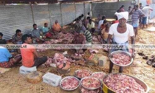 கோவிலுக்கு வந்த பக்தர்களுக்கு அன்னதானமாக கறி விருந்து வழங்கப்பட்டது. சாப்பிட்ட தட்டுகளை போடுவதற்காக கோவில் வளாகத்தில், பெரிய குழி வெட்டப்பட்டிருந்தது. சாப்பாட்டை வீட்டுக்கு எடுத்து செல்ல அனுமதியில்லை. காலை, 9:00 மணிக்கு தொடங்கிய கறி விருந்து, இரவு வரை, நீடித்தது. இதில், சுற்றுவட்டாரங்களை சேர்ந்த, 50 ஆயிரத்துக்கு மேற்பட்ட பக்தர்கள் கலந்து கொண்டு உணவு அருந்தினர். மெகா விருந்தால், சின்னக்கோசணம் பகுதியே நேற்று விழாக்கோலம் பூண்டிருந்தது.