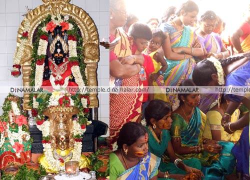 கோயிலில் இருந்து குங்குமம், பச்சரிசி, மஞ்சள்கிழங்கு, மஞ்சள் வண்ண புடவை, வளையல், வாழை, மாம்பழம், சப்போட்டோ, கொய்யா, பேரீட்சை உள்ளிட்ட பலவகை பழங்கள், கற்கண்டு, கருப்பட்டி, எண்ணெய் பதார்த்தங்கள் போன்ற சீர்வரிசைகளுடன், பாரதிநகர் விநாயகர் கோயிலுக்கு சென்றனர். சிறப்பு பூஜைகள் நடத்தப்பட்டு, முக்கிய வீதிகளில் ஊர்வலமாக கோயிலுக்கு வந்தனர். கோயில் முன்பு, கர்ப்பிணி, குழந்தை, திருமண வரம் வேண்டும் பெண்கள் வரிசையாக அமர்ந்திருந்தனர். அம்மனுக்கு சர்க்கரைப்பொங்கல், வெண்பொங்கல், தக்காளி, தயிர், எலுமிச்சை, புளியோதரை, தேங்காய் போன்ற 7 வகை சாதங்கள் படையலிடப்பட்டது. விசேஷ அபிேஷக, ஆராதனைகள் நடத்தப்பட்டு, அம்மனுக்கு வளையல் பூட்டுதல் நடந்தது. கர்ப்பிணி பெண்கள் முகத்தில் சந்தனம் பூசி, வளையல் அணிவித்து குருக்கள் இளையராஜா வளைகாப்பை துவக்கி வைத்தார். கோயில் முன்பு அமர்ந்திருந்த பெண்களுக்கு வளையல் அணிவிக்கப்பட்டு, அம்மனுக்கு மகா தீபாராதனை நடந்தது. வளைகாப்பு இட்ட பெண்களுக்கு, 7 வகை சாதங்கள் பரிமாறப்பட்டது. விழாவில் கலந்து கொண்ட பக்தர்களுக்கு, வளையல், தாலிக்கயிறு, மஞ்சள்கிழங்கு, குங்கும பிரசாதம் வழங்கப்பட்டது.