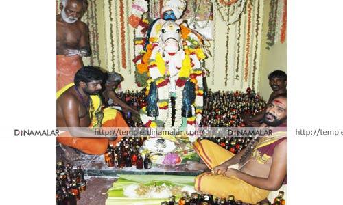 அர்ச்சகர் ரகுராம் கூறுகையில், “நினைக்கும் காரியங்கள் நிறைவேறினால் மது பாட்டில் வழங்குவதாக பக்தர்கள் வேண்டிக்கொள்வர். அவர்கள் வழங்கும் பாட்டில்களில் உள்ள மதுவை சுவாமியின் வலது பாதம் அருகில் உள்ள கலயத்தில் ஊற்றுவோம். ஒரு படி(1.5 லி.,) கொள்ளளவு கொண்ட மண் கலயம் எவ்வளவு மது ஊற்றினாலும் நிறையாது. குடிப்பது போன்ற ஒலி எழுந்தவாறு மது உறிஞ்சப்படும். சன்னதிக்குள் மது பாட்டில்களை திறந்து ஊற்றும் போது வாடை வராது. வெளிநாடுகளில் இருந்தும் மது பாட்டில்கள் அனுப்பப்படுகிறது,” என்றார்.