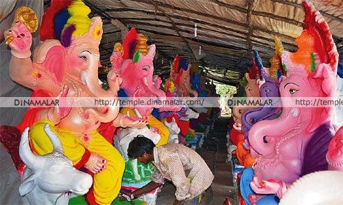 கும்மிடிப்பூண்டி: விநாயகர் சதுர்த்தியை முன்னிட்டு, ராஜஸ்தான் மாநிலத்தவரின் கைவண்ணத்தில், கண்கவர் பல வண்ண விநாயகர் சிலைகள் உருவாக்கப்பட்டு, விற்பனைக்கு வைக்கப்பட்டு உள்ளன. வட இந்தியாவை போல நம் தமிழகத்திலும், ஆடல் – பாடல், மேள தாளத்துடன், பிரம்மாண்ட விநாயகர் சிலைகளை ஊர்வலமாக எடுத்து சென்று, விநாயகர் சதுர்த்தியை வெகு விமரிசையாக கொண்டாடும் பழக்கம் அதிகரித்து வருகிறது. அதன் காரணமாக, வட மாநிலத்தை போன்று, பலவிதமான வண்ண விநாயகர் சிலைகள், நம் பகுதிகளில் தயாரிக்கப்பட்டு வருகின்றன. கும்மிடிப்பூண்டி, ஜி.என்.டி., சாலையில், மூன்று ஆண்டு காலமாக, ராஜஸ்தானைச் சேர்ந்த சிலர், தங்கள் குடும்பத்துடன் முகாமிட்டு, விநாயகர் சிலைகளை