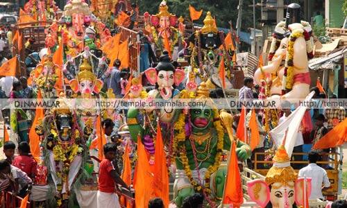 * ஊத்துக்குளி பகுதியில் பிரதிஷ்டை செய்யப்பட்ட விநாயகர் சிலைகள் விசர்ஜன ஊர்வலம், நேற்று முன்தினம் நடைபெற்றது. தலைமை வகித்து, மாநில நிர்வாகக்குழு உறுப்பினர் செந்தில் குமார் பேசுகையில், ""கோவில் வருமானத்தை கோவில்களுக்கே பயன்படுத்த வேண்டும். ஆக்கிரமிப்பில் உள்ள கோவில் சொத்துக்களை மீட்க வேண்டும், என்றார். ஊத்துக்குளி பஸ் ஸ்டாண்ட் அருகே துவங்கிய ஊர்வலம், பிரதான ரோடுகள் வழியாக வந்து, செங்கப்பள்ளி அருகே நிறைவடைந்தது. அங்கிருந்து, பாரியூர் பவானி வாய்க்காலில், விசர்ஜனம் செய்யப்பட்டது.