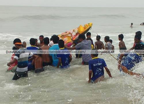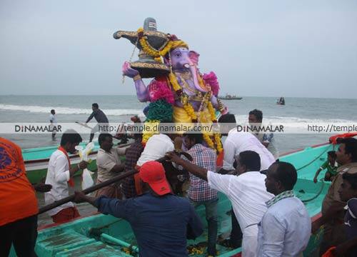 ராட்சத கிரேன்கள்: நேற்று காலையிலிருந்து, நகரின் பல்வேறு பகுதிகளிலிருந்தும், கன்டெய்னர் லாரிகள், மினி லாரிகள், டிராக்டர்கள், மாட்டு வண்டிகளில் விநாயகர் சிலைகள், ஊர்வலமாக கொண்டு செல்லப்பட்டன. அவை, நீலாங்கரை பல்கலை நகர், பட்டினப்பாக்கம், காசிமேடு மீன்பிடி துறைமுகம், திருவொற்றியூர் பகுதிகளில் உள்ள கடற்கரையில் ராட்சத கிரேன்கள் மற்றும் மீன்பிடி படகுகள் உதவியுடன் கரைக்கப்பட்டன.