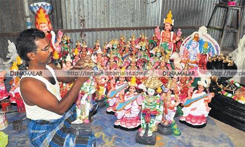 காஞ்சிபுரம்: நவராத்திரி விழாவிற்காக காஞ்சிபுரத்தில் கொலு பொம்மைகள் செய்யும் பணி மும்முரமாக நடந்து வருகிறது. நவராத்திரி விழா அடுத்த மாதம் துவங்குகிறது. இதற்காக வீடுகளில் பல வகையான கொலு பொம்மைகள் வைத்து பூஜை செய்வர். வாடிக்கையாளர்கள் விரும்பும் வகையில், பல வகையான பொம்மை கள் செய்யும் பணி, காஞ்சிபுரம் மற்றும் சுற்றியுள்ள பகுதிகளில் நடந்து வருகிறது. இங்கிருந்து பிற மாநிலங்களுக்கும் பொம்மைகள் விற்பனை செய்யப்படுகின்றன. குறிப்பாக, துர்க்கை அம்மன், கருமாரியம்மன், வள்ளி, தெய்வானையுடன் முருகன், ரங்கநாதர், பஞ்சமுக ஆஞ்சநேயர் போன்ற பொம்மைகள் செய்யப்படுகின்றன. ஆண்டு தோறும் வேலைஇருக்கும். கிருஷ்ண ஜெயந்தி, விநாயகர் சதுர்த்தி, நவராத்திரி ஆகிய விழாவிற்காக பொம்மைகள் செய்து வருகிறோம். மழை காலத்தில் வேலை அதிகமாக இருக்காது. இந்த தொழிலை நம்பி, 450 குடும்பங்கள் இருக்கின்றன. இந்த தொழிலுக்கு வங்கியில் அல்லது மாவட்ட தொழில் மையத்தின் மூலம் கடன் வழங்கினால் இன்னும் பல குடும்பங்கள் வாழும்.
