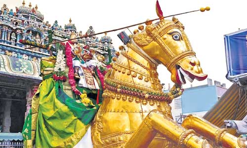 கோயில் நவராத்திரி விழாவில் கோவர்த்தனாம்பிகை அம்பாள் தினமும் ஒரு கொலு அலங்காரத்தில் அருள்பாலித்தார். விழாவின் உச்ச நிகழ்ச்சியாக நேற்று மாலை சுப்பிரமணிய சுவாமி, வெள்ளி வில், அம்புடன், தங்கக்குதிரை வாகனத்தில் பசுமலை அம்பு போடும் மண்டபத்தில் எழுந்தருளினார். சுவாமி முன் யாகம் வளர்க்கப்பட்டு பூஜைகள் நடந்தன. அங்குள்ள வன்னி மரத்தடியில், வில், அம்பு வைக்கப்பட்டு, சந்தனம், மஞ்சள் பொடி உட்பட திரவிய அபிஷேகங்கள், விக்னேஷ்வர பூஜை, வர்ணபூஜை முடிந்து எட்டு திக்குகளிலும், பலி பூஜை முடிந்து, சுவாமியின் பிரதிநிதியான சிவாச்சாரியாரிடம் வில், அம்பு வழங்கப்பட்டது. அவர் நான்கு திசைகளிலும் அம்பு எய்தார். தீபாராதனை முடிந்து பக்தர்களின் திருக்கண் மண்டகப்படிகளில் சுவாமி எழுந்தருளினார்.