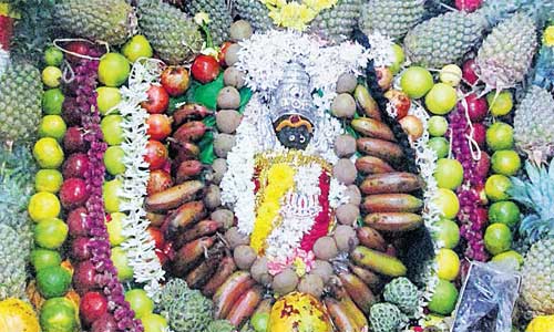 திருத்தணி:விஜயதசமியையொட்டி, தணிகாசலம்மன் கோவிலில், நேற்று, பால்குட அபிஷேகம் மற்றும் பழ வகைகளால் சிறப்பு அலங்காரம் நடந்தது.