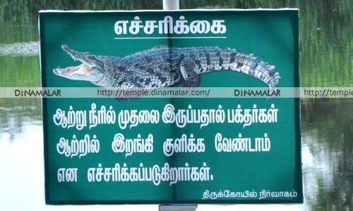 பக்தர்கள் குளிக்க தடை:சண்முக நதி ஆற்றில் முதலை நட மாட்டம் உள்ளதால், யாரும் குளிக்க வேண்டாம் என, கோவில் நிர்வாகம் சார்பில் எச்சரிக்ைக அறிவிப்பு பலகை ைவக்கப்பட்டது.