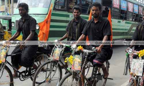 திண்டுக்கல் : ஆந்திரா மாநிலம் வடக்கு கோதாவரி மாவட்டத்தில் இருந்து சபரிமலைக்கு மூவாயிரம் கி.மீ., சைக்கிளில் யாத்திரை செல்லும் ஐயப்ப பக்தர்கள் நேற்று திண்டுக்கல் வந்தனர்.ஆந்திர மாநிலம் சங்கப்பராஜபுரத்தை சேர்ந்தவர்கள் நாகசீனிவாஸ் 33, சுப்ரமணியன், 24, வெங்கடேஸ்வரராவ் 41, கிரண்குமார், 22. இவர்கள் கடந்த 6 ஆண்டுகளுக்கும் மேலாக ஆந்திராவிலுள்ள மேற்கு கோதாவரி மாவட்டம் சங்கப்பராஜபுரத்தில் இருந்து கார்த்திகை துவங்குவதற்கு முன்பாக சைக்கிளில் புறப்பட்டு திண்டுக்கல் வழியாக சபரிமலைக்கு யாத்திரை சென்று வருகின்றனர். திண்டுக்கல் வந்த யாத்திரைக்குழுவின் வெங்கடேஸ்வரராவ் கூறியதாவது: கார்த்திகை மாதம் துவங்குவதற்கு இரண்டு நாள் முன்பாகவே சைக்கிளில் சங்கப்பராஜபுரத்தில் யாத்திரையை துவக்கினோம். அங்கிருந்து சென்னை வந்தோம்.பின், திருச்சி வழியாக திண்டுக்கல்- - குமுளி - -பம்பை வழியாக சபரிமலை செல்கிறோம் எங்கள் ஊரிலிருந்து ஆயிரத்து 500 கி.மீ., துாரத்தில் சபரிமலை அமைந்துள்ளது.சுவாமி தரிசனம் முடிந்து, மீண்டும் சைக்கிளிலேயே ஊர் திரும்புவோம்.முதல் ஆண்டில் 15 பேர் சேர்ந்து நடைபயணமாக வந்தோம். பிறகு சைக்கிளில் நாள் ஒன்றுக்கு 150 கிலோ மீட்டர் பயணம் மேற்கொண்டு சபரிமலை சென்றோம். பத்து நாட்கள் பயணத்தில் சன்னிதானம் அடைந்து விடுவோம். வழியில் இடையூறு எதுவும் வந்ததில்லை. ஓட்டல்களில்தான் சாப்பிடுகிறோம். ஐயப்பனின் அருளால் மன நிம்மதி கிடைப்பதோடு, சைக்கிளில் செல்வதால் உடலும் வலுவாகிறது, என்றார்.