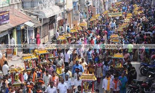 திருவண்ணாமலை: திருவண்ணாமலை அருணாசலேஸ்வரர் கோவில் தீப திருவிழாவில், நேற்று, 63 நாயன்மார்கள் வீதி உலா வந்து பக்தர்களுக்கு அருள்பாலித்தனர். திருவண்ணாமலை அருணாசலேஸ்வரர் கோவில் கார்த்திகை தீப திருவிழா, கடந்த, 3ல் கொடியேற்றத்துடன் துவங்கி நடந்து வருகிறது. இதில் நேற்று, சிவபெருமானை நினைத்து மனமுருகி, ஐந்து எழுத்து மந்திரத்தை ஓதி வழிபட்ட, 63 நாயன்மார்களுக்கு சிறப்பு அபி?ஷகம் மற்றும் சிறப்பு பூஜை நடந்தது. தொடர்ந்து வண்ண மலர்களால் அலங்கரிக்கப்பட்ட, 63 நாயன்மார்களை, பள்ளி மாணவர்கள் பலலக்கில் தூக்கிச் சென்றனர். மாட வீதியில் வலம் வந்தனர். இதில், ஆயிரக்கணக்கான பக்தர்கள், சிவனடியார்கள், சாதுக்கள் பங்கேற்றனர்.