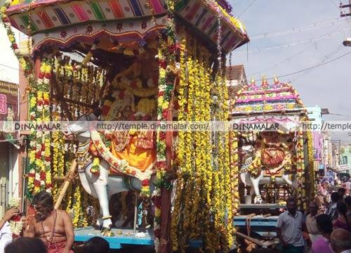 இதன் படி பரமக்குடி விசாலாட்சி அம்பிகா சமேத சந்திரசேகர சுவாமி கோயிலில் காலை 4 மணிக்கு சிறப்பு ஹோமங்கள், அபிஷேகம் நடந்தது. தொடர்ந்து மூலவர் சிறப்பு அலங்காரத்தில் அருள்பாலித்தார். காலை 9 மணிக்கு ரிஷப வாகனத்தில் பஞ்சமூர்த்திகள் புறப்பாடு நடந்தது. அப்போது மூஞ்சூரு வாகனத்தில் விநாயகர், மயில் வாகனத்தில் முருகன், வள்ளி, தெய்வானை முன் செல்ல, ஈஸ்வரன் பிரியாவிடையுடனும், விசாலாட்சி தனித்தேரில் ரிஷப வாகனத்தில் வீதியுலா சென்றனர்.