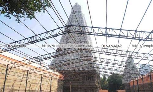 திருவண்ணாமலை: திருவண்ணாமலை அருணாசலேஸ்வரர் கோவிலில், விரைவில் கும்பாபிஷேகம் நடக்க உள்ள நிலையில், யாக சாலை அமைந்துள்ள பகுதியில், பிரம்மாண்ட பந்தல் அமைக்கும் பணி துவங்கியுள்ளது. திருவண்ணாமலை அருணாசலேஸ்வரர் கோவிலில், கடந்த, 2002ல் கும்பாபிஷேகம் நடத்தப்பட்டது. 12 ஆண்டுகளுக்கு ஒரு முறை கும்பாபிஷேகம் நடத்தப்படுவது வழக்கம். அதற்காக, அருணாசலேஸ்வரர் கோவிலில் கும்பாபிஷேகம் நடத்த, கடந்த ஆண்டு ஜன., 26ல் பாலாலயம் செய்யப்பட்டது. இதையடுத்து, 27 கோடி ரூபாய் மதிப்பில் கும்பாபி?ஷக பணிகள் துவங்கி நடந்து வந்தது. கோவிலில் உள்ள அனைத்து சன்னதிகள், கோபுரங்களில் மராமத்து பணிகள் நடந்து, வர்ணம் பூசப்பட்டது. அனைத்து பணிகளும் முடிந்த நிலையில், வரும், 2017 பிப்., 6ல் கோவில் கும்பாபிஷேகம் நடத்த முடிவு செய்யப்பட்டுள்ளது. இதையடுத்து உடனடியாக கும்பாபிஷேகத்திற்கான பூர்வாங்க பணிகளை துவங்க, கடந்த மாதம், 20ல் பந்தக்கால் நடப்பட்டது. இதை தொடர்ந்து, ஐந்தாம் பிரகாரத்தில், யாகசாலை அமைப்பதற்கான பணி துவங்கியது. இடையில் கார்த்திகை தீப திருவிழா வந்ததால், கும்பாபிஷேக பணியில் தொய்வு ஏற்பட்டது. தற்போது தீப திருவிழா முடிந்த நிலையில், கும்பாபிஷேகத்திற்கான பணி சுறுசுறுப்படைந்துள்ளது. யாக சாலை அமைக்கப்பட்டுள்ள, ஐந்தாவது பிரகாரம், அம்மணி அம்மன் கோபுரம் அருகில், பிரம்மாண்ட பந்தல் அமைக்கும் பணி நேற்று துவங்கியது.