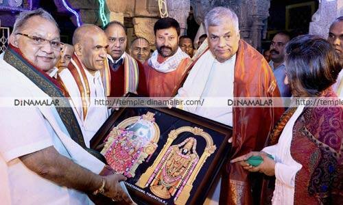 திருப்பதி: இலங்கை பிரதமர் ரணில் விக்ரமசிங்கே, திருமலையில், தன் குடும்பத்தினருடன் ஏழுமலையானை வழிபட்டார். ஏழுமலையானை வழிபட, இலங்கை பிரதமர் ரணில் விக்ரமசிங்கே, தன் மனைவியுடன் நேற்று முன்தினம் மாலை, திருப்பதி, திருமலைக்கு வந்தார். இரவு, திருமலையில் தங்கிய அவர், நேற்று காலை வைகுண்டம் காத்திருப்பு அறை வழியாக, தன் மனைவி மற்றும் இலங்கை அமைச்சர்களுடன் ஏழுமலையானை தரிசிக்க சென்றார். தரிசனம் முடித்து திரும்பிய அவருக்கு, தேவஸ்தான அதிகாரிகள் ஏழுமலையான் சிறப்பு பிரசாதம் வழங்கினர். இதன்பின், ரணில் கூறியதாவது: ஏழுமலையான் தரிசனம் மனதிற்கு அமைதியை தருமென அனைவரும் கூறியதால் வந்தேன். தேவஸ்தானம் புதிதாக துவங்க உள்ள, எஸ்.வி.பி.சி., தமிழ் தொலைக்காட்சிக்கு என் வாழ்த்துக்கள். இதன் மூலம் உலகம் முழுவதிலும் உள்ள, தமிழ் மக்கள், ஏழுமலையானுக்கு நடக்கும் தினசரி ஆர்ஜித சேவைகள், இதர உற்சவங்களை, தங்கள் வீட்டிலிருந்தே பார்க்க முடியும்.இவ்வாறு அவர் கூறினார்.