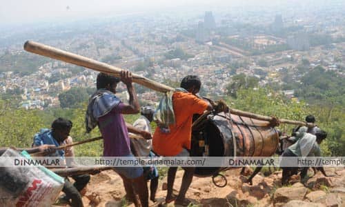 மலையில் இருந்து இறக்கப்பட்டு, கோவிலுக்கு கொண்டு வரப்பட்டது. கோவில்