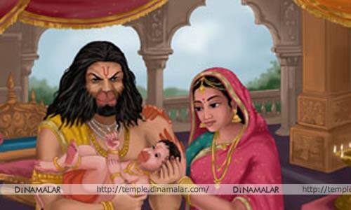 ராமாவதாரம் நிகழ இருந்த வேளையில், அவருக்கு சேவை செய்ய பறவைகள், விலங்கினங்களெல்லாம் முன் வந்தன. பரமேஸ்ரவரனுக்கும் அந்த அவதாரத்துக்கு சேவை செய்யும் எண்ணம் ஏற்பட்டது. தன் விருப்பத்தை அவர் தேவியிடம் தெரிவித்தார். வானரப்பிள்ளை ஒன்றைப் பெற்றுத்தர கேட்டார். தனக்கு அழகான இரண்டு குழந்தைகள் இருக்க வானரப்பிள்ளை தேவையில்லை என அவள் மறுத்துவிட்டாள். எனவே, ருத்ராம்சமான தன் சக்தி உலகத்தில் எத்தனையோ குழந்தை இல்லாத தாய்மார்களில் ஒருத்திக்கு கிடைக்கட்டுமே என நினைத்தார் பரமேஸ்வரன். தன் சக்தியை எடுத்துச்செல்லும் படி வாயு பகவானுக்கு உத்தரவிட்டார். புஞ்ஜிகஸ்தலை என்ற தேவலோக அப்சரஸ் பூலோகம் வந்தாள். ஒரு காட்டில் தவம் செய்து கொண்டிருந்த ரிஷியின் உருவத்தை கேலி செய்தாள்.
