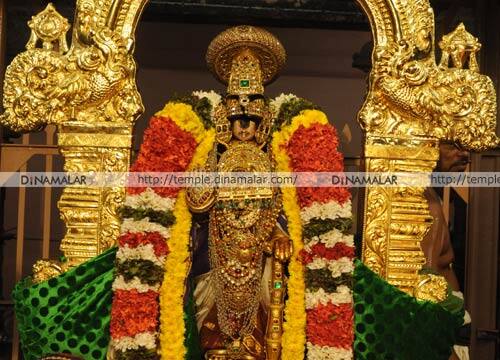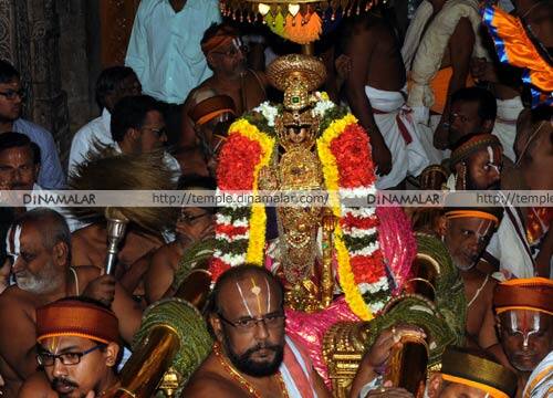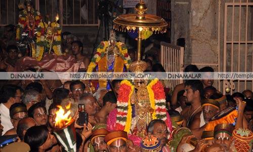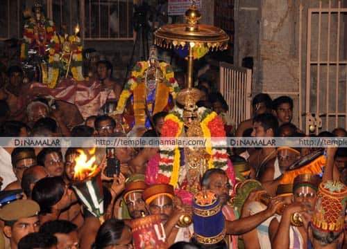 திருச்சி ஸ்ரீரங்கம் ரெங்கநாதர் கோவிலில் நடந்து வரும் பகல்பத்து உற்சவத்தின் ஐந்தாம் நாளில் நம்பெருமாள் மூலஸ்தானத்தில் இருந்து பாண்டியன் கொண்டை, விமான பதக்கம், முத்துச்சரம், அடுக்குப்பதக்கம் உள்ளிட்ட அலங்காரத்தில் அர்ச்சனா மண்டபத்துக்கு எழுந்தருளினார். ஏராளமான பக்தர்கள் தரிசனம் செய்தனர்.