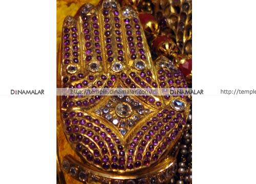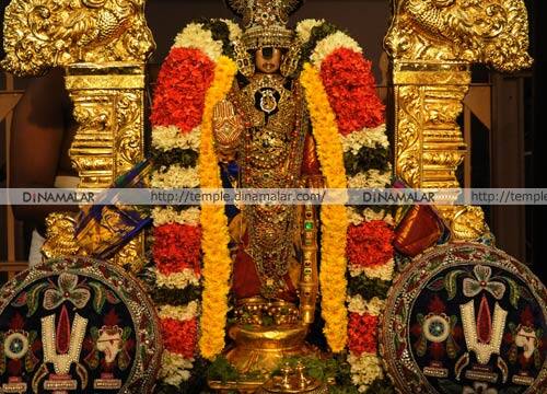 திருச்சி: ஸ்ரீரங்கம் ரெங்கநாதர் கோவிலில் நடந்து வரும் பகல்பத்து உற்சவத்தின் ஏழாம் நாளில் நம்பெருமாள் மூலஸ்தானத்தில் இருந்து முத்துவளைவு கொண்டை, வைரஅபயஹஸ்தம், வைர மாலை, முத்துமாலை, பவள மாலை, லெட்சுமி பதக்கம் உள்ளிட்ட அலங்காரத்தில் அர்ச்சனா மண்டபத்துக்கு எழுந்தருளினார்.