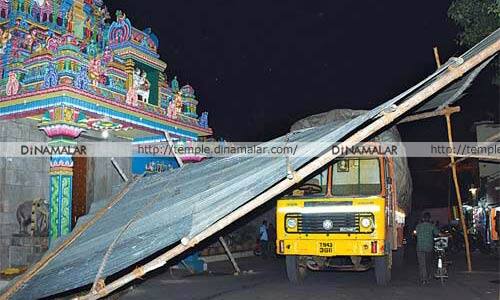 திருப்பூர்: திருப்பூர், ஸ்ரீ விஸ்வேஸ்வரசுவாமி கோவிலில், வரும் 11ம் தேதி, ஆருத்ரா தரிசன விழா நடக்கிறது. இதற்காக, கோவில் ராஜகோபுர முன், தகர ஷெட் பந்தல் அமைக்கப்பட்டுள்ளது. நேற்று இரவு, அவ்வழியே வந்த லாரி, பந்தல் மீது மோதியது. இதில், 30 அடி நீளத்தில் அமைக்கப்பட்டி ருந்த, பந்தல் லாரி மீது அப்படியே சரிந்தது. பந்தல் சரிந்த நேரத்தில், அவ்வழியே யாரும் செல்லாததால், அசம்பாவிதம் தவிர்க்கப்பட்டது. கோவி லின் முக்கிய திருவிழாவான ஆருத்ரா தரிசனத்தில், பல ஆயிரக்கணக்கான பக்தர்கள் பங்கேற்க உள்ள நிலையில், விழாவுக்காக, அமைக்கப்பட்ட பந்தல், அடியோடு சரிந்தது விஷயம், அதிர்ச்சியை ஏற்படுத்தியுள்ளது. ஏற்கனவே, கோவில் நிர்வாகத்தின் மீது பல்வேறு புகார்கள் உள்ள நிலையில், தற்போது விழா பந்தல் சரிந்துள்ளது, அபசகுனமாகவே பார்க்கப்படுகிறது. எனவே, அதற்கு உரிய பரிகார பூஜை செய்து, மீண்டும் பந்தல் அமைக்க வேண்டும், என பக்தர்கள் கோரிக்கை விடுத்துள்ளனர். இது குறித்து, திருப்பூர் தெற்கு போலீசார் விசாரித்து வருகின்றனர்.