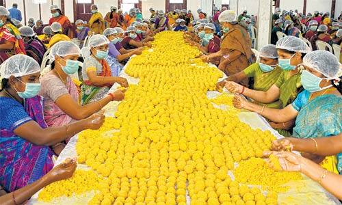 அதற்காக, லட்டு தயாரிக்கும் பணி ஜன.6ல் நடைபெற்றது. பழைய பஸ் ஸ்டாண்ட் அருகே உள்ள காமாட்சியம்மன் திருமண மண்டபத்தில், 75 சமையல் பணியாளர்களும், 600க்கும் அதிகமான பக்தர்களும், லட்டு தயாரிக்கும் பணியில் ஈடுபட்டனர். ஒரு டன் கடலை மாவு, இரண்டு டன் சர்க்கரை, 160 கிலோ நெய், 1200 கிலோ ஆயில் மற்றும் முந்திரி, திராட்டை, ஏலக்காய் பயன்படுத்தி, லட்டு தயாரிக்கப்பட்டது. காலை, 8:00 மணிக்கு துவங்கி, மாலை 6:00 மணி வரை, இப்பணி நடந்தது.