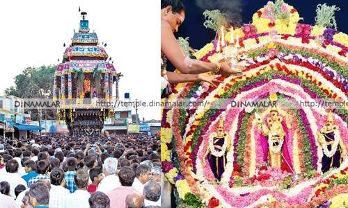 நேற்று அதிகாலை, முருகன், வள்ளி, தெய்வானைக்கு சிறப்பு அபிஷேகம் நடந்தது. காலை, 6:18 மணிக்கு கைலாசநாதர் கோவிலில் இருந்து புறப்பட்ட உற்சவ மூர்த்திகள், ௬:32 மணிக்கு தேர்களில் எழுந்தருளினர். முதல் தேரில், விநாயகர், பெரிய தேரில் அமர்தவள்ளி, சுந்தரவள்ளி சமேதராக தங்க கவச அலங்காரத்தில் முருகப்பெருமான், மூன்றாம் தேரில், நடராஜர் சமேதராக எழுந்தருளினார். காலை, 6:43 மணிக்கு, ஈரோடு கலெக்டர் பிரபாகர், ஆர்.டி.ஓ., நர்மதா தேவி வடம் பிடித்து, தேரோட்டத்தை துவக்கினர். ஏராளமான பக்தர்கள் வடம் பிடித்தனர். அப்போது, கந்தனுக்கு அரோகரா, முருகனுக்கு அரோகரா என்ற கோஷம், விண்ணை பிளந்தது. வழி நெடுக திரண்டிருந்த பக்தர்கள், தேர்கள் மீது உப்பு, மிளகு மற்றும் கடலைக்காய், நெல் துாவி வழிபட்டனர். நேற்று மாலை, 5 மணிக்கு, வடக்குராஜ வீதியில், தேர் நிலை நிறுத்தப்பட்டது. இன்று மாலை, நிலையை அடைகிறது.