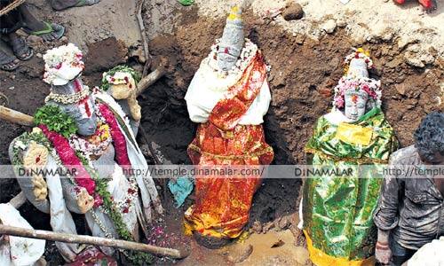அப்போது, அந்த சிலைக்கு அருகே மேலும், இரண்டு சிலைகள் இருப்பது தெரியவந்தது. அவற்றையும் வெளியில் எடுத்து, சுத்தம் செய்த அப்பகுதி மக்கள், பெருமாள் சிலைக்கு அருகில் வைத்து ஸ்ரீதேவி, பூதேவி சிலைகள் கிடைத்திருப்பதாக கூறி, மஞ்சள், குங்குமம் வைத்து, பட்டு புடவை, துளசி மாலை அணிவித்து வழிபாடு செய்தனர். தகவலறிந்த பாகூர் தாசில்தார் கார்த்திகேயன், சம்பவ இடத்திற்கு சென்று, சிலைகளை பறிமுதல் செய்யப்போவதாக தெரிவித்தார். இதற்கு, அப்பகுதி மக்கள் எதிர்ப்பு தெரிவித்து, தாசில்தார் கார்த்திகேயனை முற்றுகையிட்டு, கடும் வாக்குவாதத்தில் ஈடுபட்டனர். சிலைகளை ஏற்றிச் செல்ல வந்த வாகனத்தையும் உள்ளே நுழைய விடாமல் பெண்கள் தடுத்து நிறுத்தி, திருப்பி அனுப்பியதால் பரபரப்பு ஏற்பட்டது.