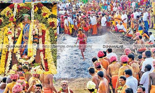 மேலும், 27 அடி உயர தேரில், விநாயகர் சிறப்பு அலங்காரத்தில் பக்தர்களுக்கு அருள்பாலித்தார். பின், வடம் பிடித்த இரண்டு தேரும், குண்டம் இறங்கும் இடத்திற்கு வந்து நிலை நிறுத்தப்பட்டது. இரவு 9:30 மணி முதல் குண்டம் பூ வளர்த்தல் நிகழ்ச்சி நடந்தது. தொடர்ந்து, நேற்று காலை சிறப்பு பூஜைகள் நடைபெற்றன; அருளாளிகள், பக்தர்கள் குண்டத்தில் இறங்க தயாராக வந்தனர். முதலில், அம்மன் அருளாளி தண்டபாணி, பூச்செண்டு உருட்டி குண்டத்தில் இறங்கினார். அவரை தொடர்ந்து, விரதமிருந்த 400க்கும் மேற்பட்ட பக்தர்கள் குண்டத்தில் வரிசையாக இறங்கினர். மேலும், பக்தர்கள், ஒன்பது அடி அலகு குத்திக்கொண்டும் குண்டம் பூவில் இறங்கி வேண்டுதலை நிறைவேற்றினர். திரளான பக்தர்கள், பங்கேற்று, குண்டம் இறங்கும் நிகழ்ச்சியை கண்டுகளித்தனர். குண்டம் இறங்கும் நிகழ்ச்சியையடுத்து, திருத்தேர் வடம் பிடிக்கப்பட்டு, கோவில் அருகே நிலை நிறுத்தப்பட்டது. மக்கள் வெள்ளத்தில் தேர் ஊர்ந்து சென்ற போது, பலரும் பழங்களை வீசி எறிந்து, தர்மராஜா மற்றும் திரவுபதியம்மனை வழிபட்டனர். மேலும், குண்டத்தில் இறங்கிய பக்தர்கள், பாரம்பரிய நடனத்தை ஆடி மகிழ்ந்தனர். பின், மாலையில், தேர் வடம் பிடிக்கப்பட்டு, முக்கிய வீதிகள் வழியாக உலா வந்தது. அம்மனின் தாய் வீடு என அழைக்கப்படும் வீட்டில் இரவு நிலை நிறுத்தப்படும். தொடர்ந்து, இன்று திருத்தேர் நிலை நிறுத்தம்; ஊஞ்சல், பட்டாபிேஷகமும்; நாளை மஞ்சள் நீராடுதல், போர் மன்னன் காவு உள்ளிட்ட நிகழ்ச்சியும் நடக்கிறது.