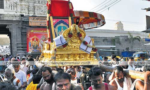 நான்கு ராஜவீதி முன்னதாக, மண்டலாபிஷேகம் பூர்த்தி விழாவில், நேற்று மாலை, 5:00 மணிக்கு காமாட்சி அம்மன் கோவிலில் இருந்து புதியதாக செய்யப்பட்ட தங்க பல்லக்கு, பக்தர்கள் பார்வைக்காக, நான்கு ராஜ வீதிகளில் எடுத்து செல்லப்பட்டது. தங்க தகடால் அழகுற செய்யப்பட்டிருந்த பல்லக்கில், அம்மன் படம் வைக்கப்பட்டு, கோவில் ஊழியர்களால் வீதிகளில் எடுத்துச் செல்லப்பட்டது. ஊர்வலம் எடுத்துச் செல்லப்பட்ட அம்மனை, ஏராளமான பக்தர்கள் பார்த்து வழிபட்டனர்.