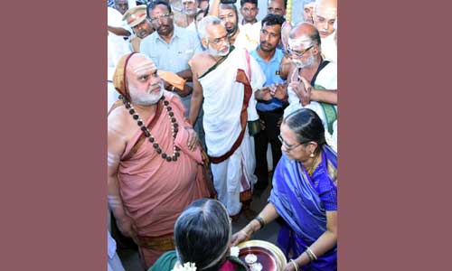 இது குரு, சீடர் ஒற்றுமையை குறிக்கிறது. எனது குருநாதன் என்னை சீடர்க்ளுக்கு அறிமுகம் செய்து இவர் தான் அடுத்த குரு, என்றார். அதே போல் சீடரை உங்களுக்கு அறிமுகம் செய்து வைக்க வேண்டிய கடமை என்னிடம் உள்ளது. அதற்காகவும், மகாருத்ரம் சத்சண்டீ பாராயணம், சந்திர மவுலீஸ்வர பூஜை செய்வதற்காகவும் மதுரை வந்துள்ளேன்.எல்லோரும் தர்மம் செய்ய வேண்டும். அதர்மம் செய்யக்கூடாது. பகவத் சிந்தனையுடன் இருக்க வேண்டும் என்றார். விதுசேகர பாரதீ சுவாமி உபன்யாசம் செய்தார். இன்று (மார்ச் 28) முதல் ஏப்.,2 வரை காலை 7:30 மணிக்கு சாரதா சந்திர மவுலீஸ்வரர் பூஜை நடக்கிறது. காலை 10:00 மணிக்கு பாத பூஜை, மாலை 5:00 மணிக்கு பாரதீ தீர்த்த சுவாமி, விதுசேகர பாரதீ சுவாமியின் உபன்யாசம். இரவு 8:00 மணிக்கு சாரதா சந்திர மவுலீஸ்வரர் பூஜை நடக்கிறது.