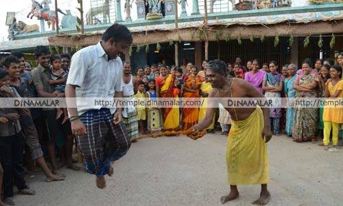 நாமகிரிப்பேட்டை: சீராப்பள்ளி மாரியம்மன் கோவிலில் சாட்டையடி வாங்கி பக்தர்கள் வினோத நேர்த்திக்கடன் செலுத்தினர். நாமக்கல் மாவட்டம், நாமகிரிப்பேட்டை அடுத்த சீராப்பள்ளி மாரியம்மன் கோவில் பண்டிகை கடந்த வாரம் துவங்கியது. நேற்று முன்தினம் இரவு பூச்சட்டி எடுக்கும் நிகழ்ச்சி நடந்தது. நேற்று அதிகாலை பக்தர்கள் ஊர்வலமாக கோவிலை வலம் வந்தனர். பின், பூச்சட்டியில் இருந்த நெருப்பை கோவில் முன் கொட்டியவுடன், பக்தர்கள் அதை திருநீறாக எடுத்து நெற்றியில் பூசிக்கொண்டனர். தொடர்ந்து சாட்டையடி நிகழ்ச்சி நடந்தது. அருள் வந்த பூசாரி, பக்தர்களை சாட்டையால் அடித்து ஆசி வழங்கினார். பக்தர்கள் தங்களது பிரார்த்தனை நிறைவேறினாலும் அல்லது ஏதாவது ஒரு கோரிக்கையை மனதில் நினைத்துக்கொண்டும் பூசாரி முன் வந்து கையை தூக்கி வரிசையாக நிற்கின்றனர். சாட்டையுடன் நிற்கும் பூசாரி அருள் வந்து பக்தர்களை அடிக்கிறார். ஒவ்வொருவராக வரும் பக்தர்கள் கையை உயர்த்தி நடனமாடிக்கொண்டே சாட்டையடி வாங்கி செல்கின்றனர். இதுகுறித்து, பக்தர்கள் கூறுகையில், சட்டையடி வாங்கினால் நன்மை நடக்கும் என்ற நம்பிக்கை உள்ளதால், வேண்டுதல் இல்லை என்றாலும் பூசாரி கையால் பக்தர்கள் சாட்டையடி வாங்கிக் கொள்கின்றனர் என்றனர்.