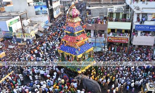 உடுமலை நகரின் மையத்தில் அமைந்துள்ளது பழமை வாய்ந்த மாரியம்மன் கோவில். மூல விக்ரகத்தின் முன்பு சுயம்பு உருவாகிய சிறப்பு பெற்ற தலமாக இக்கோவில் உள்ளது. கோவிலில் ஆண்டுதோறும், விமர்சையாக திருத்தேரோட்டம் நடக்கிறது. இதற்காக, மார்ச் 28 ல், நோன்பு சாட்டப்பட்டது. திருக்கம்பம் நிலைநாட்டுதல் செய்த பிறகு நகரமே விழாக்கோலம் பூண்டுள்ளது. திருவிழாவின் முக்கிய நிகழ்வான, திருத்தேரோட்டம் இன்று( ஏப்13ல்) கோலாகலமாக நடைபெற்றது. காலை 6:00 மணிக்கு மேல், மகாசக்தி மாரியம்மன் திருத்தேருக்கு எழுந்தருளல் நிகழ்ச்சி நடைபெற்றது. தொடர்ந்து, மாலை 4:15 மணிக்கு மேல், திருத்தேரோட்டம் நடைபெற்றது. விழாவில் ஏராளமான பக்தர்கள் கலந்துகொண்டு தேரை வடம் பிடித்தனர்.