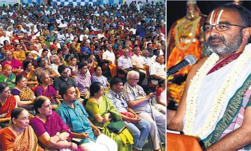 மதுரை: மனதில் விதைக்கப்படும் நல்ல உபதேசங்கள் தான் மனிதனை மாற்றும். இறைவனை நாட வைக்கும், என வேளுக்குடி கிருஷ்ணன் பேசினார். சத்குரு சங்கீத சமாஜம், தமிழ்நாடு பிராமணர் சங்கம் சார்பில், மதுரை லட்சுமி சுந்தரம் ஹாலில் நடந்த உபன்யாசத்தில், ஆசார்ய தேவோ பவ தலைப்பில் அவர் பேசியதாவது: தாய், தந்தை, ஆச்சாரியன், விருந்தினர்களைத் தான் தெய்வமாக கொள்ள வேண்டும். பெற்றவர்களை தெய்வ மாக மனது ஏற்றுக் கொள்ளும். தேசிகன், குரு, ஆச்சாரியன் இவர்கள் பெற்றோரை விட ஞானப்பிறவியை கொடுப்பவர்கள்.குருவானவர் உள்இருட்டை போக்க உபதேசம் செய்து, பரமாத்மாவை சொல்லிக் கொடுப்பவர். தேசிகன் நல்வழி காட்டி, வைகுண்ட பாதையை அடைய வழிகாட்டுபவர். ஆன்மிக பயணம், தொண்டுகள் செய்தல், இறைவனை தியானித்தல் மூலம் இப்பாதையை அடையலாம்.ஆச்சாரியன் இதிகாசம் கற்று அதன்படி நடப்பவன். தன்னை நம்பியவர்களை வழிநடத்துபவன். அவன் வழியில் நடந்தால் இறைவனை அடைந்து முக்தியடையலாம். தெய்வத்தை பூஜிப்பது போல் ஆச்சாரியர்களையும் பூஜிக்க வேண்டும். விருந்தினர்களாலும் இறைவனை அடைய முடியும், என்றார்.சத்குரு சங்கீத சமாஜ கவுரவ செயலர்கள் ராஜாராம், வெங்கட்டநாராயணன், பிராமணர் சங்க தலைவர் கிருஷ்ணசாமி, பொதுச்செயலர் ரவி, விஸ்வாஸ் புரமோட்டர்ஸ் உரிமையாளர் சங்கரசீத்தாராமன் மற்றும் பலர் வரவேற்றனர். இன்றும், நாளையும் உபன்யாசம் நடக்கிறது.